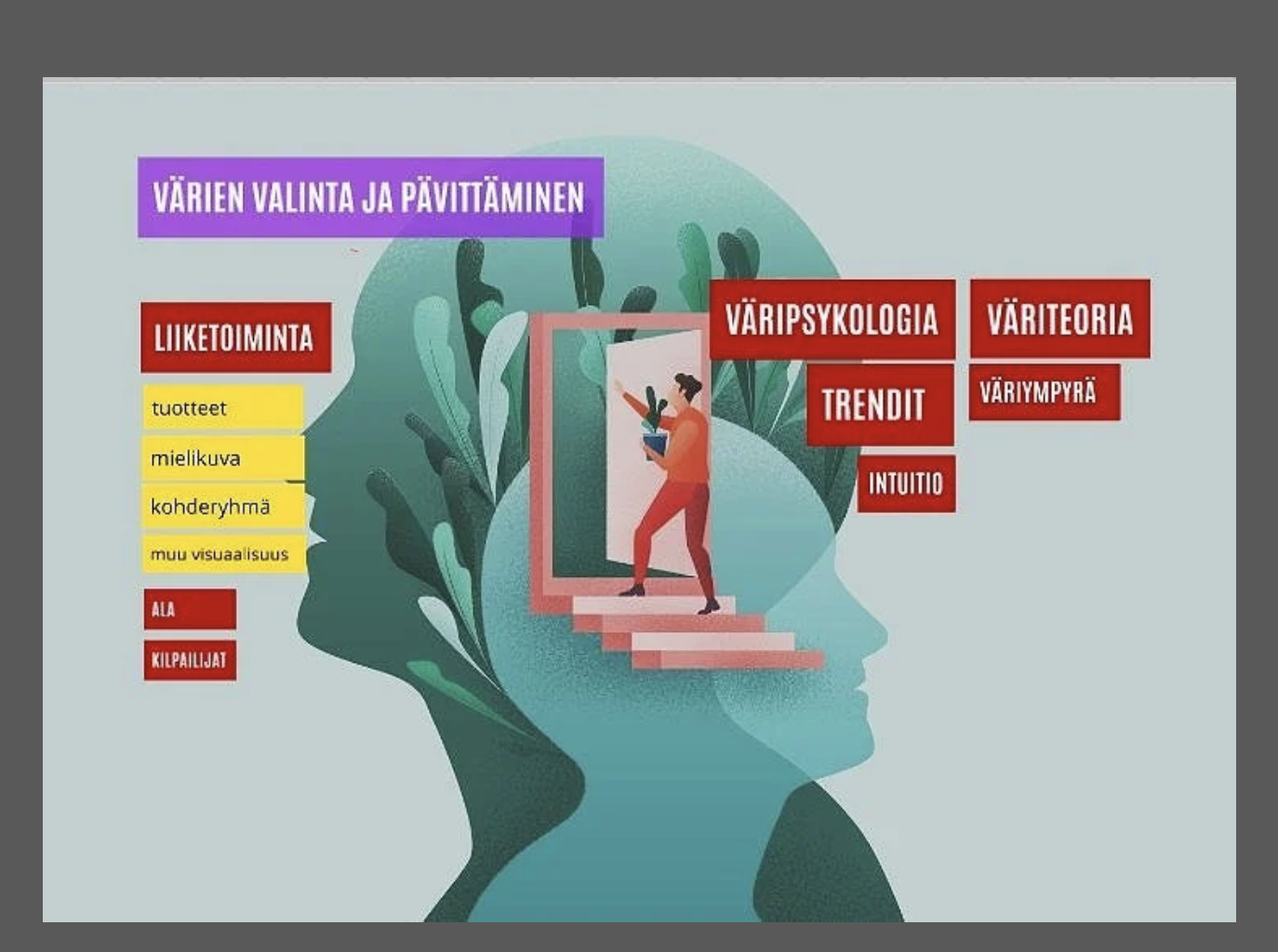 Värit eivät koskaan ole vain värejä - kauniita tai ei, yhteensopivia tai ei. Värit kommunikoivat tunteista. Väripsykologia kertoo, miten ihmiset reagoivat keskimäärin eri väreihin. Markkinoinnissa haluamme vaikuttaa tunteisiin. Ostopäätökset tehdään tunteilla.