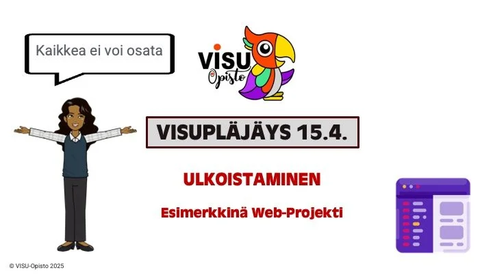kaipaatko sparrausta tai parempaa tulosta vISUAALISella VIESTINnällä? kerron, miten. visuaalisesti viisas verkossa.Poimi talteen parhaat vinkit. Visuaalisesti Viisas Verkossa - yleistä PIKAOPAS LEHTI-ILMOITUKSEN TEKOON VIDEOIDEN TEKEMINEN ILMAN VIDEO-OSAAMISTA Ulkoistaminen Vaikuttavan esityksen tekeminen VAIKUTA, VAKUUTA JA VALLOITA VÄREILLÄ